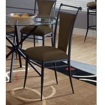 With simple sweeping lines and a black powder-coat finish, the Cierra Dining Chair makes an attractive, bold, contemporary statement. The backs are tall with elegant character, and the seats are cushioned and covered with microfiber upholstery for extreme comfort. The seats arrive in sets of two; choose your favorite color: Atmosphere, Bear, Black, Fawn, or Flame. Dimensions: 17W x 16D x 40H inches. About Hillsdale Furniture Located in Louisville, KY, Hillsdale Furniture is a leader in top-quality, affordable bedroom furniture. Since 1994, Hillsdale has combined the talents of nationally recognized designers and globally accredited factories to bring you furniture designs from around the globe. Hillsdale combines the best in finishes, materials, and designs to bring both beauty and value with every piece. The combination of top-quality metal, wood, stone, and leather has given Hillsdale the reputation for leading-edge style and concepts. Black powder-coat finish on metal frames. Features include tall backs and cushioned seats. Soft, easy-to-clean microfiber upholstery. Available in 5 different fabric colors. Dimensions: 17W x 16D x 40H inches.