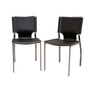 You will enjoy the clean design of this contemporary leather dining chair. The shine of the chrome-finished steel frame contrasts beautifully with the matte brown bonded leather of the seat. The edges of the leather are finished with a single line of stitching in light beige. Small black plastic non-marking feet are included to protect your floor. The modern dining chair works equally well in a professional setting as a leather office chair or as waiting room furniture. Set of 2.